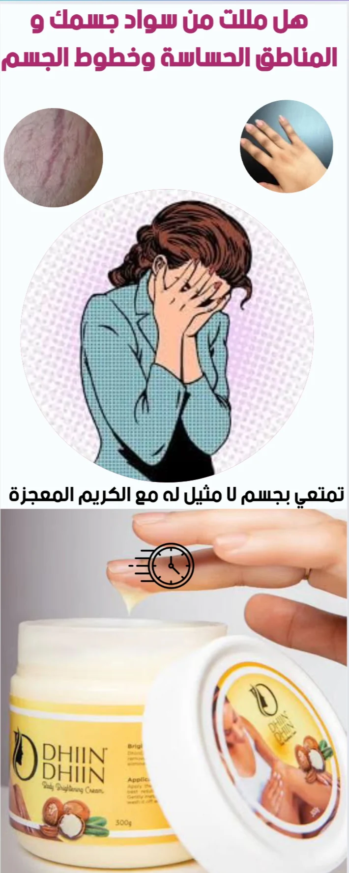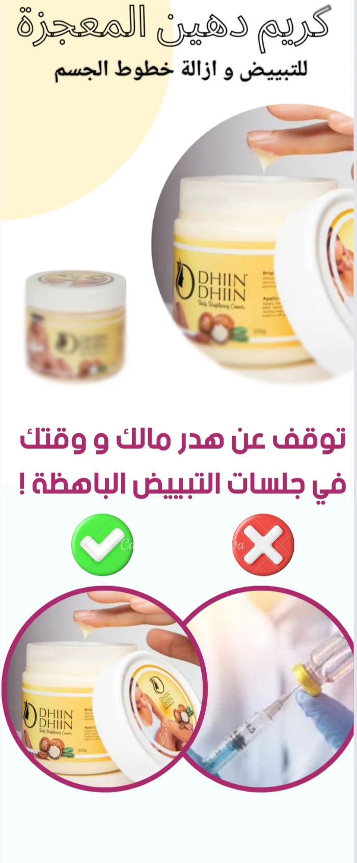 استعد لتحقيق بشرة أحلامك مع كريم DHIIN DHIIN، الحل الأمثل لتفتيح وتبييض البشرة بطريقة طبيعية وفعّالة. تمتع بتجربة فريدة ومذهلة مع هذا الكريم الذي يعمل على تحسين مظهر بشرتك وجعلها أكثر إشراقاً وجمالاً.
